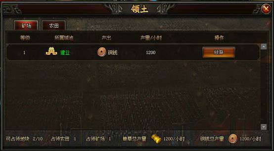 领土有2种,矿场和农田,玩家可以对本国境内的矿场和农田派遣部队进行占领,挑战成功即可占领。
